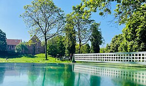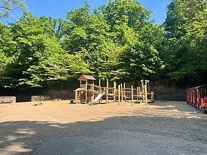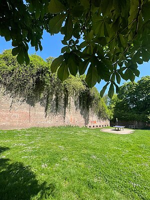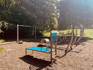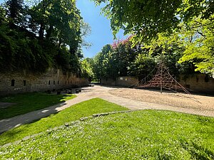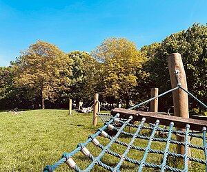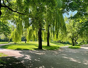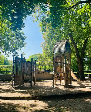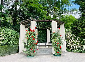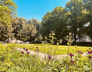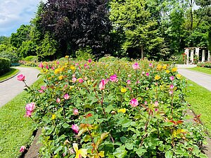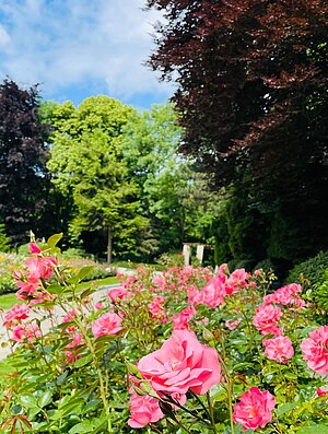 Der Park ist ein besonderer Ort mit viel Ruhe. Er ist ein bisschen versteckt und es gibt einen Rosengarten mit 40 verschiedenen Rosensorten. Außerdem gibt es einen Spielplatz, einen Basketballkorb und viele Bänke unter schattigen Bäumen.